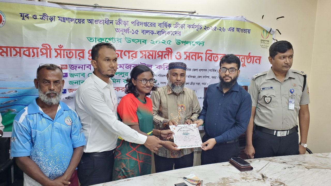বগুড়ায় মাসব্যাপি সাঁতার প্রশিক্ষণের শিক্ষার্থীদের মাঝে সদনপত্র বিতরণ