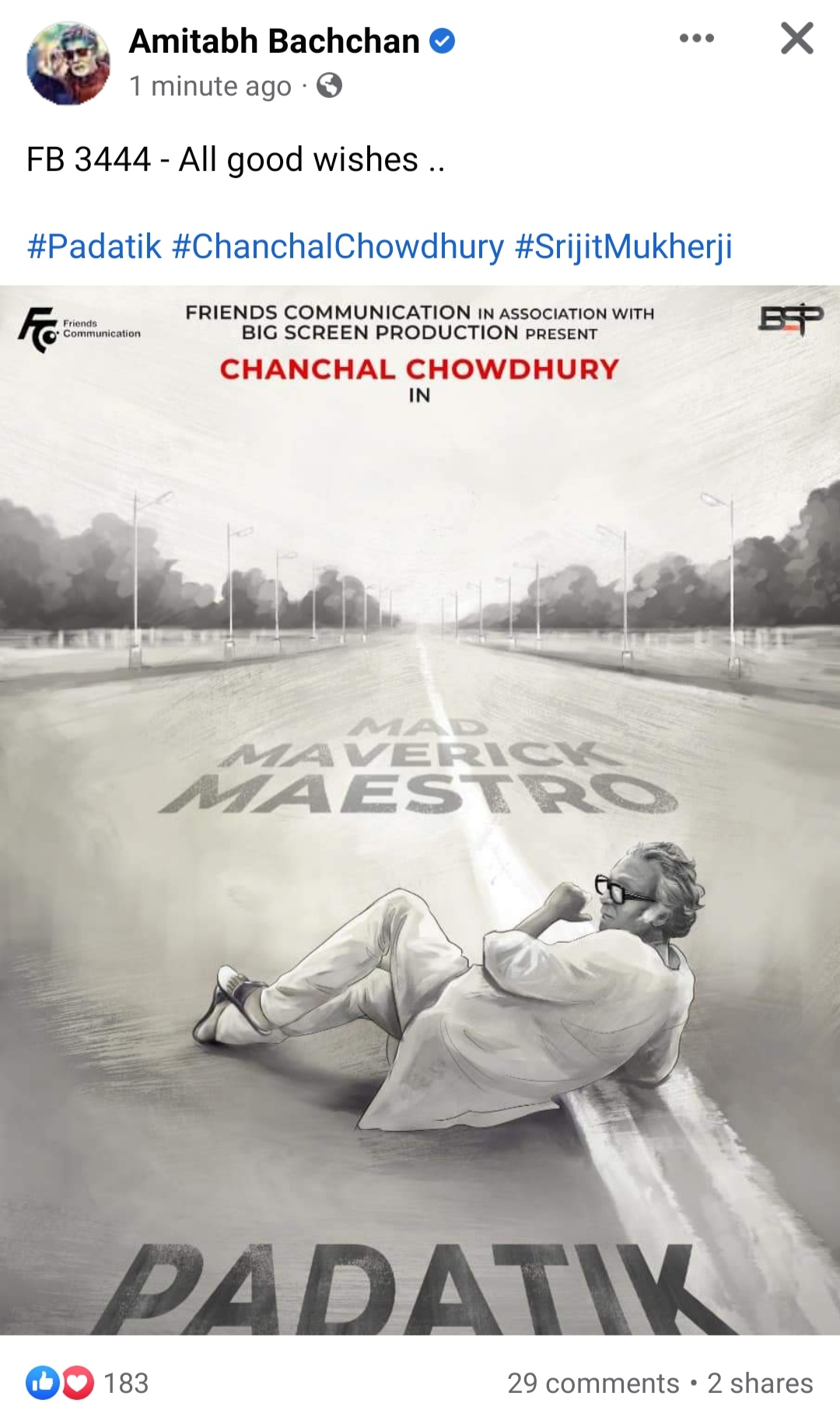 পদাতিক সিনেমার পোস্টার শেয়ার করে অমিতাভ লিখেছেন, ‘সবকিছুর জন্য শুভকামনা।’