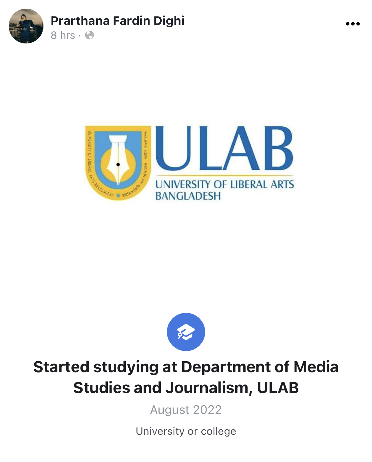 অভিনয় জীবনের পাশাপাশি প্রতিশ্রুতিশীল চলচ্চিত্র তারকা প্রার্থনা ফারদিন দীঘিও পড়াশোনা চালিয়ে যাচ্ছেন। সম্প্রতি ইউনিভার্সিটি অব লিবারেল আর্টস বাংলাদেশে (ইউল্যাব) মিডিয়া স্টাডিজ অ্যান্ড জার্নালিজম বিভাগে ভর্তি হয়েছেন এমন একটি পোস্ট সামাজিক যোগাযোগ মাধ্যম ফেসবুকে দিয়েছেন এই অভিনেত্রী।