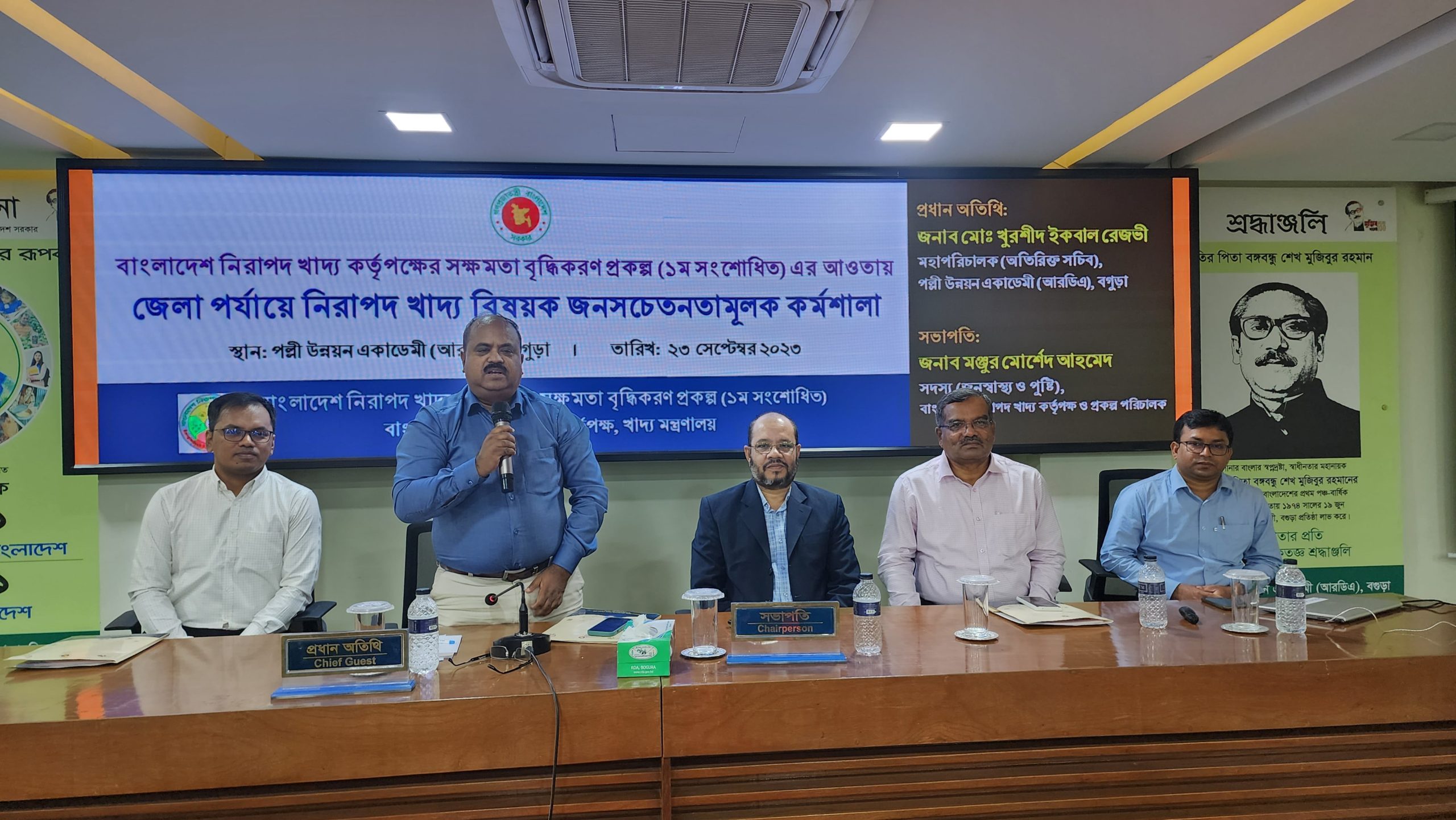 শনিবার (২৩, সেপ্টেম্বর) বগুড়া পল্লী উন্নয়ন একাডেমি (আরডিএ)-তে নিরাপদ খাদ্য বিষয়ক কর্মশালা অনুষ্ঠিত হয়। বাংলাদেশ নিরাপদ খাদ্য কর্তৃপক্ষের সক্ষমতা বৃদ্ধিকরণ প্রকল্প (১ম সংশোধিত) এর আওতায় জেলা পর্যায়ে নিরাপদ খাদ্য বিষয়ক জনসচেতনতামূলক কর্মশালায় বক্তব্য রাখেন অনুষ্ঠানের প্রধান অতিথি হিসেবে বক্তব্য রাখেন পল্লী উন্নয়ন একাডেমির মহাপরিচালক (অতিরিক্ত সচিব) জনাব মোঃ খুরশীদ ইকবাল রেজভী।