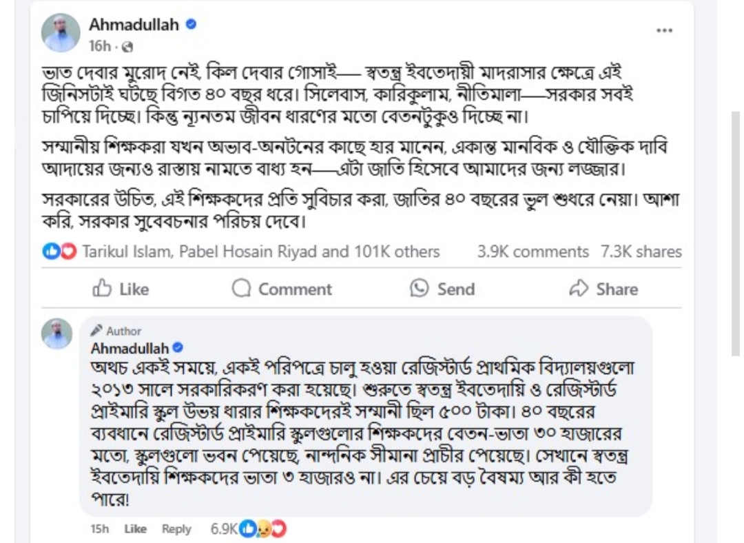 পাঠকদের জন্য শায়খ আহমাদুল্লাহর স্ট্যাটাসটি হুবহু তুলে ধরা হলো-