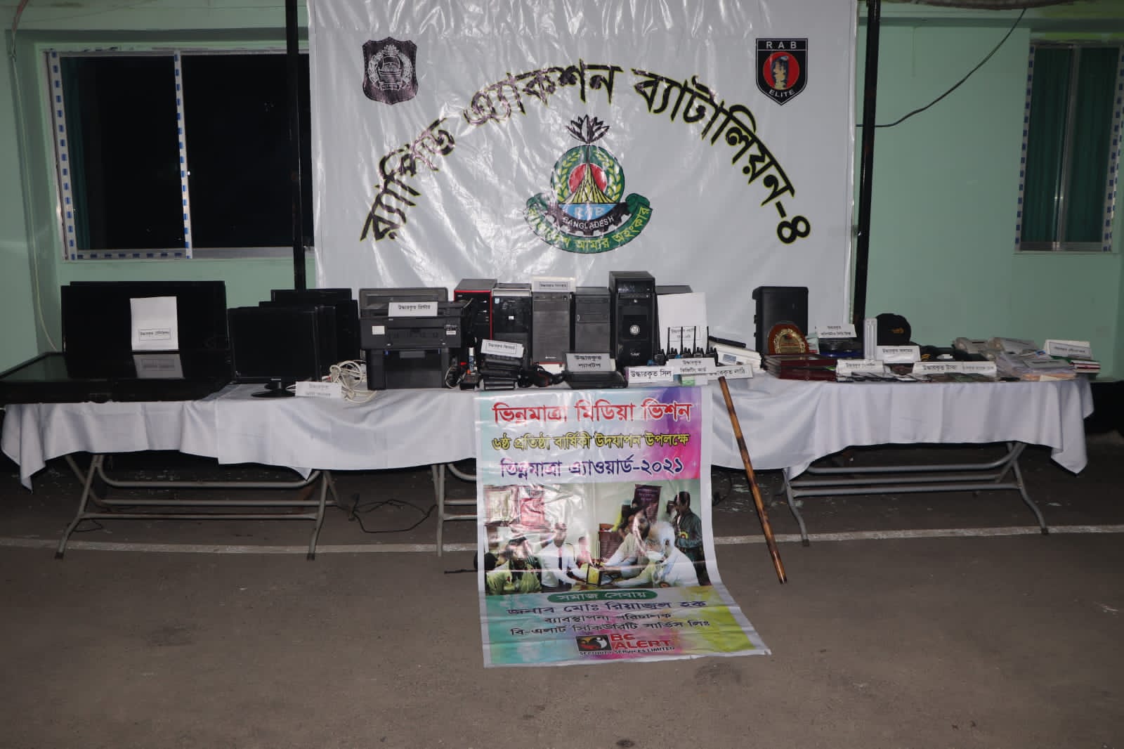 গতকাল ফ্রেব্রুয়ারি রাজধানীর দক্ষিণখান এলাকার বিএলার্ট সিকিউরিটি সার্ভিসেস লিঃ এর অফিসে অভিযান চালিয়েসিকিউরিটি গার্ডে চাকুরী দেওয়ার কথা বলে প্রতারণামূলকভাবে অর্থ আত্মসাৎ করার অপরাধে ওয়াকিটকি সেট ০৫ টি, ওয়াকিটকি চার্জার ০২ টি, স্ক্যানার ০২ টি, সিল ০২ টি, কম্পিউটার সেট ০২ টি, ভর্তি ফরম ২০ টি, ভিজিটিং কার্ড ১০০ টি, এবংনগদ ৭১,৬৭২/- টাকা সহ জনকে গ্রেফতার করে র‍্যাব।