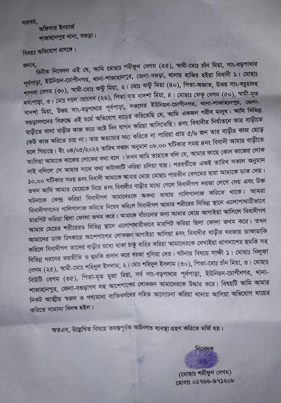 শরীফুন বেগম জানান, তিনি একজন অসহায় দরিদ্র মানুষ। অন্যের বাড়িতে কাজ করে জীবিকা নির্বাহ করেন। বুধবার সকাল ৮টার দিকে প্রতিবেশী মৃত বাদশা মিয়ার স্ত্রী ফেকু বেগম (৫০) তার বাড়িতে এসে কাজের মেয়ের সন্ধান চান। ফেকু বেগম কাজের মেয়ের সাথে ভাল আচরন না করায় তার বাড়িতে কোন কাজের মেয়ে থাকতে চায় না। ভাল আচরন না করায় এপর্যন্ত ৫/৬ জন কাজের মেয়ে চলে গেছে। একথা বলায় ফেকু বেগম তার উপর ক্ষেপে যান। পরে একই দিন সকাল ১০টার দিকে ফেকু বেগম কৌশলে তাকে ও তার গর্ভবতি মেয়েকে তার বাড়িতে ডেকে নিয়ে যান। বাড়িতে ঢোকা মাত্রই ফেকু বেগম গেটের দরজা লাগিয়ে দেয় এবং কাজের মেয়েকে নির্যাতন করার কথা বলার অপরাধে জঘন্য ভাষায় গালিগালাজ করে। একপর্যায়ে ফেকু বেগম ও তার প্রভাষক মেয়ে শাপলা বেগম, ছেলে নয়ন হোসেন (২৬), মেয়েজামাই ঝন্টু মিয়া (৪০) সহ সবাই মিয়ে এলোপাথারি মারধর করে। এসময় তার গর্ভবতি মেয়েকেও মারধর করে তারা।