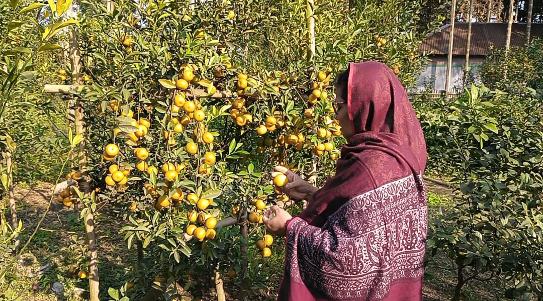 লালমনিরহাটে থোকায় থোকায় ঝুলছে হলুদ রঙের কমলা, চাষে শিক্ষক দম্পতির সাফল্য