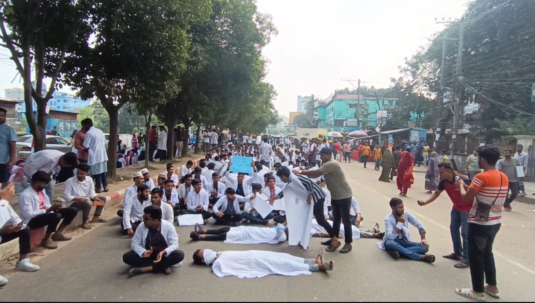 বগুড়ায় কাফনের কাপড় গায়ে আবারো সড়ক অবরোধ করে বিক্ষোভ শিক্ষার্থীদের