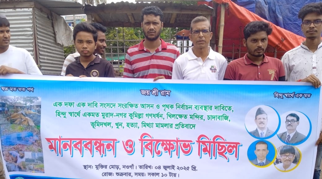 নওগাঁয় বিভিন্ন দাবি নিয়ে হিন্দু মহাজোটের মানববন্ধন-বিক্ষোভ