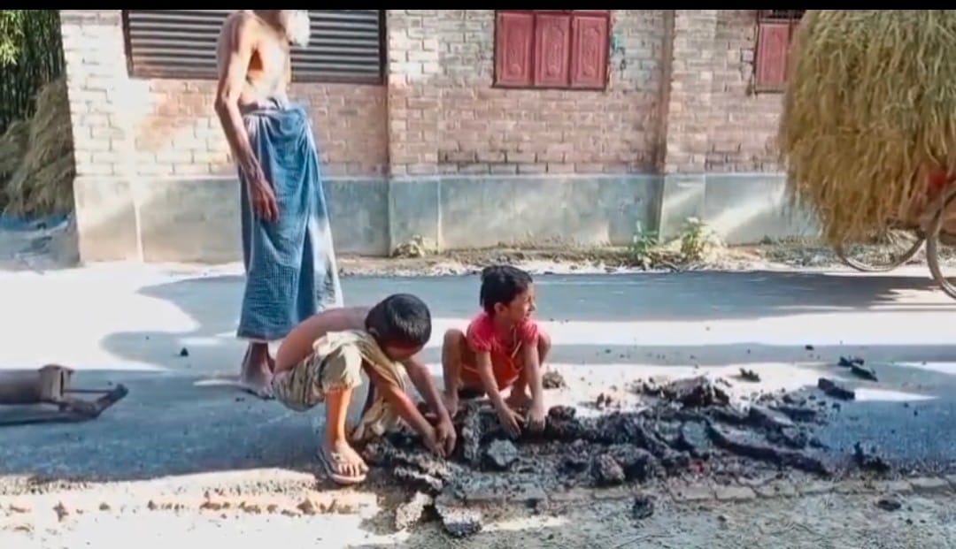 হাতের টানেই উঠে আসছে সড়কের কার্পেটিং; তুলে খেলা করছে শিশুরা